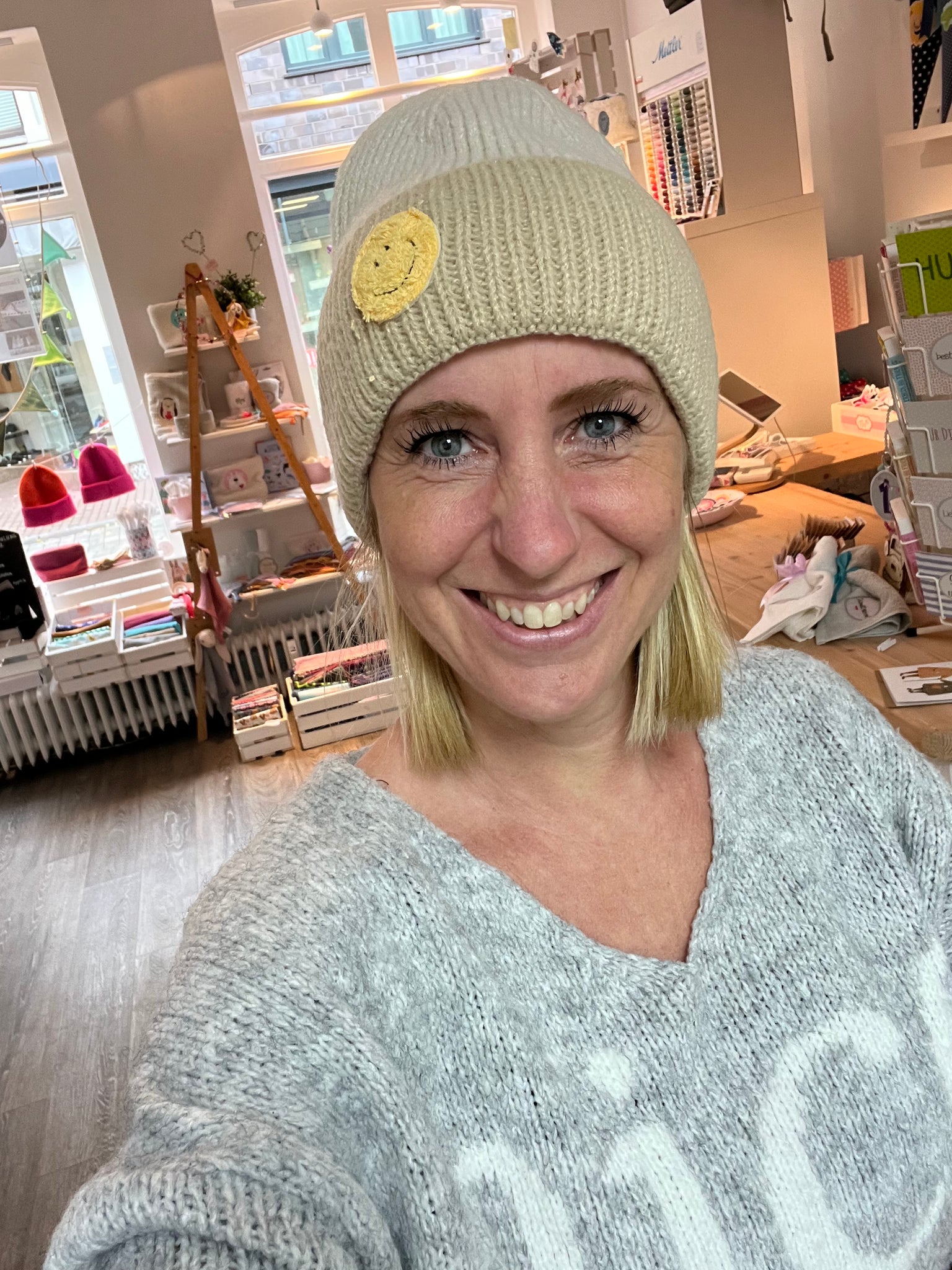 Stylische Mütze 2-farbig , wahlweise mit kleiner Smiley Applikation möglich.